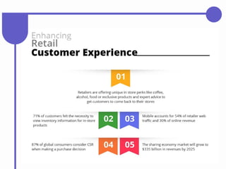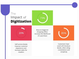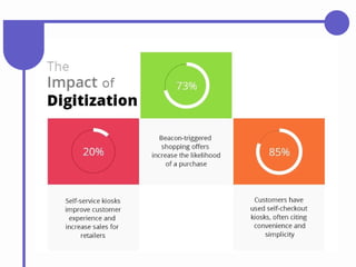 The document discusses the transformative impact of technology on the retail industry, highlighting the rise of e-commerce, changing consumer behaviors, and the necessity for traditional retailers to adapt. Key technological trends including mobile applications, social shopping, extended reality, and artificial intelligence are reshaping retail operations and customer interactions. The piece also addresses the challenges faced by brick-and-mortar stores, including store closures, and emphasizes the importance of leveraging innovative retail technology to enhance customer experience and operational efficiency.