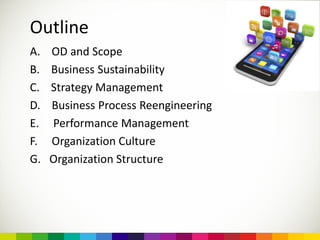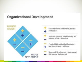 The document outlines an organization development plan with the goal of helping an organization sustain growth. It discusses 8 factors critical for business success: strategy, execution, culture, structure, talent, leadership, innovation, and mergers & acquisitions. 16 modules are proposed to address these factors, focusing on areas like strategic planning, performance management, leadership development, and improving productivity. The plan aims to increase profitability, engagement, and capabilities over a 4-year period through initiatives relating to strategy, talent management, and culture change.