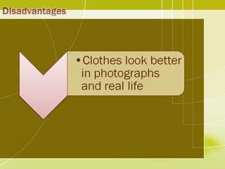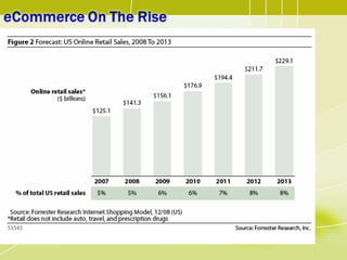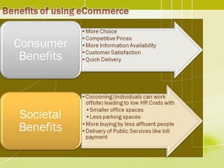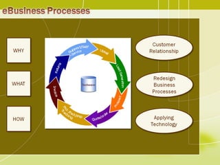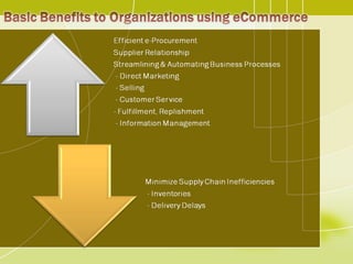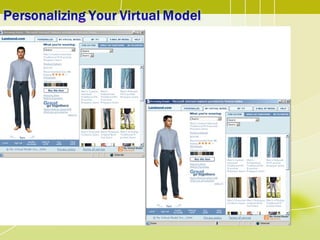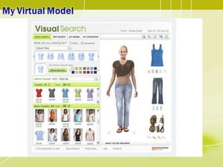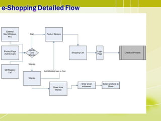 The document discusses some technical and non-technical limitations of B2C e-commerce including protocols not being standardized, insufficient bandwidth, difficulty integrating systems, customer fears around privacy and security, cultural and linguistic challenges, lack of critical mass in certain markets, and resistance to change. It also provides a high-level overview of an e-commerce order processing workflow involving order placement, cancellation, payment processing, shipment tracking, returns and more. Finally, it discusses how virtual fitting rooms can help online shoppers virtually try on clothes and help retailers through increased sales and reduced costs and returns.