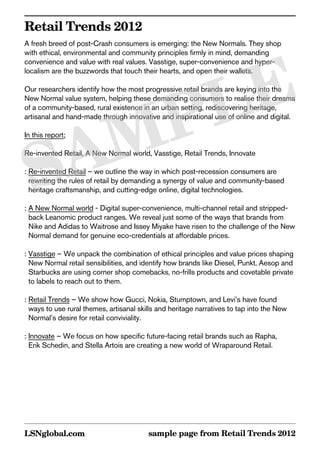 The document discusses emerging retail trends for 2012. It notes that post-recession consumers, called "New Normals", demand ethical values and community principles in addition to value and convenience. Retail brands are keying into this "New Normal" mindset by offering artisanal, local products through innovative online and digital approaches. The report outlines trends like reinvented retail, digital convenience, and brands promoting genuine values through partnerships with small producers.