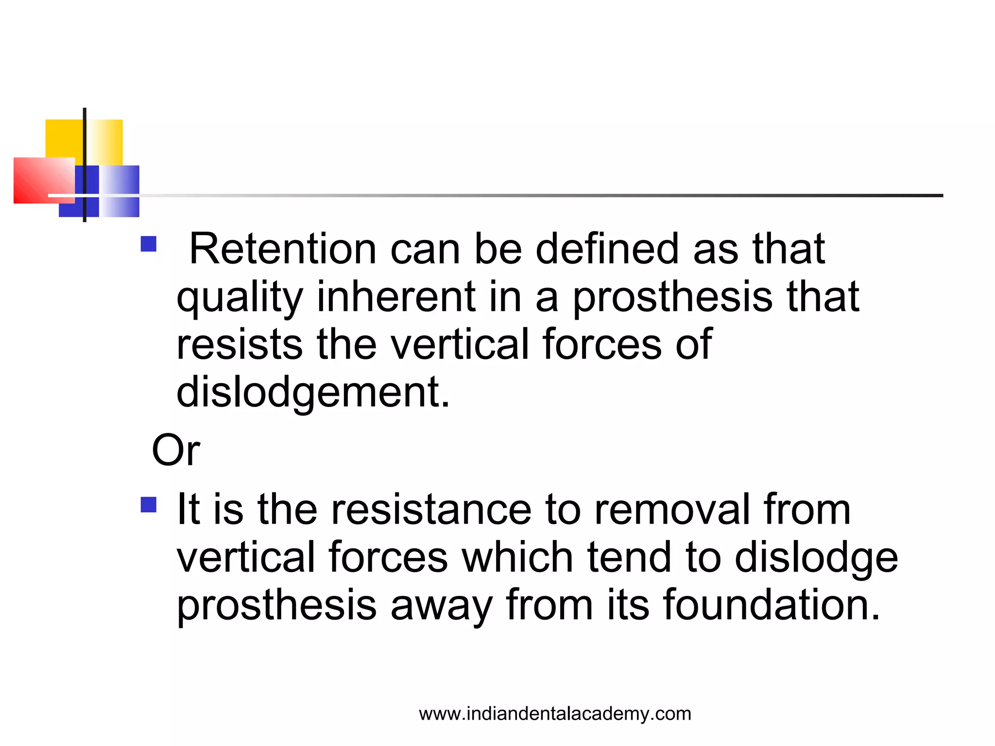 The document discusses retention mechanisms for removable partial dentures (RPD), emphasizing the importance of direct and indirect retainers that resist dislodgement. It outlines various types of clasps used in RPD design along with their advantages, disadvantages, and specific applications. Key design principles and factors affecting clasp function and denture stability are also highlighted in the context of optimizing retention and support.