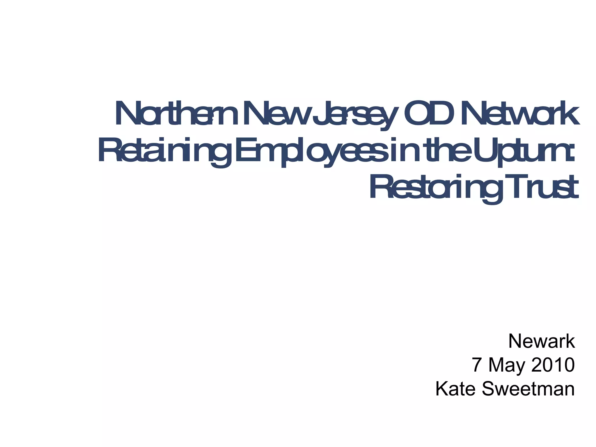 The document discusses the challenges of retaining employees in a post-recession environment, highlighting the need for leaders to foster trust and engagement among workers. It emphasizes the importance of adjusting leadership styles to meet the evolving needs of a diverse workforce, noting that many employees feel burnt out and dissatisfied with their work-life balance. The text suggests that successful retention strategies involve creating a positive organizational culture and facilitating open communication between leaders and employees.