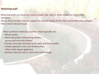 Retaining walls are structures used to retain soil or rock in a vertical position. Common materials used include wood, steel, concrete, and gabions. Retaining walls are classified as externally or internally stabilized. Externally stabilized include in-situ and gravity walls. Internally stabilized include reinforced soils and in-site reinforcement. Design considerations include ensuring stability against overturning, sliding, and overloading soils. Design also accounts for active and passive earth pressures. Common gravity wall types are massive gravity, crib, and cantilever walls. In-situ walls include sheet pile, soldier pile, and slurry walls. Reinforced and geosynthetic retaining walls are advanced wall types.