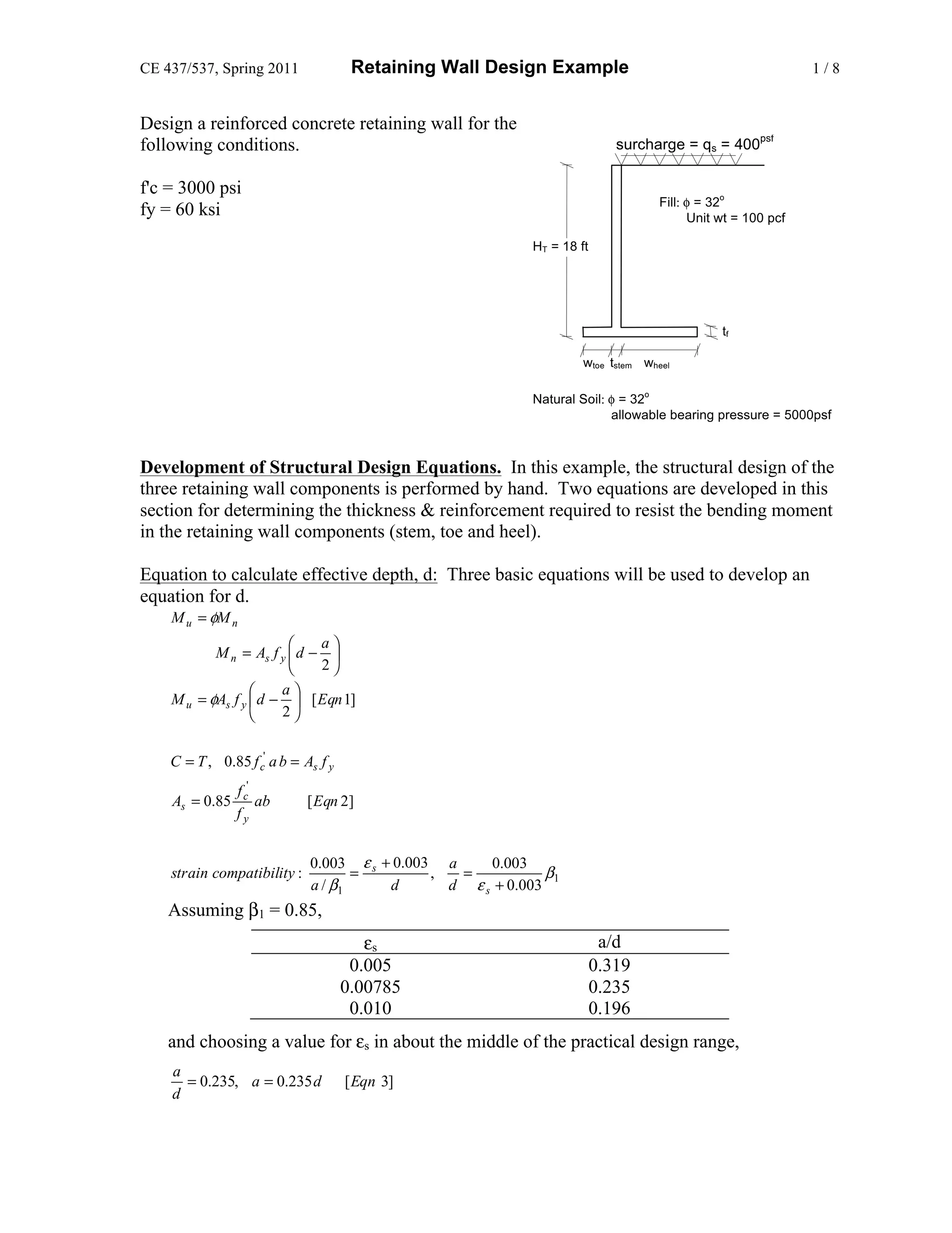 The document provides a design example for a reinforced concrete retaining wall with the following conditions: