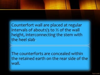 This document discusses retaining walls and their design. It begins by defining a retaining wall as a structure used to maintain ground surfaces at different elevations. It then lists the main parts of retaining walls and describes the four primary types: gravity walls, semi-gravity walls, cantilever walls, and counterfort walls. The document explains the different earth pressures - at rest, active, and passive - that retaining walls must resist. It outlines the key design considerations around stability, bearing capacity, and avoiding tension. Retaining wall design requires analyzing overturning, sliding, bearing pressure, and ensuring no tension develops at the base.