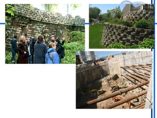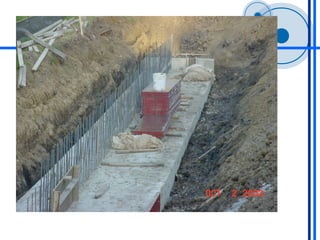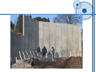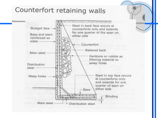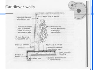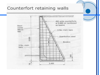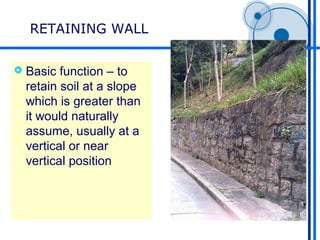 Retaining walls are designed to retain soil at an angle greater than its natural slope, usually in a near-vertical position. They work by either their own mass or through leverage to prevent overturning, sliding, or soil overload. Design considerations include the subsoil type and water table level, as they can impact bearing capacity and hydrostatic pressure. Common wall types are gravity, cantilever, counterfort, precast concrete, and precast crib walls. Proper design is needed to ensure stability based on the wall height, materials, and subsurface conditions.