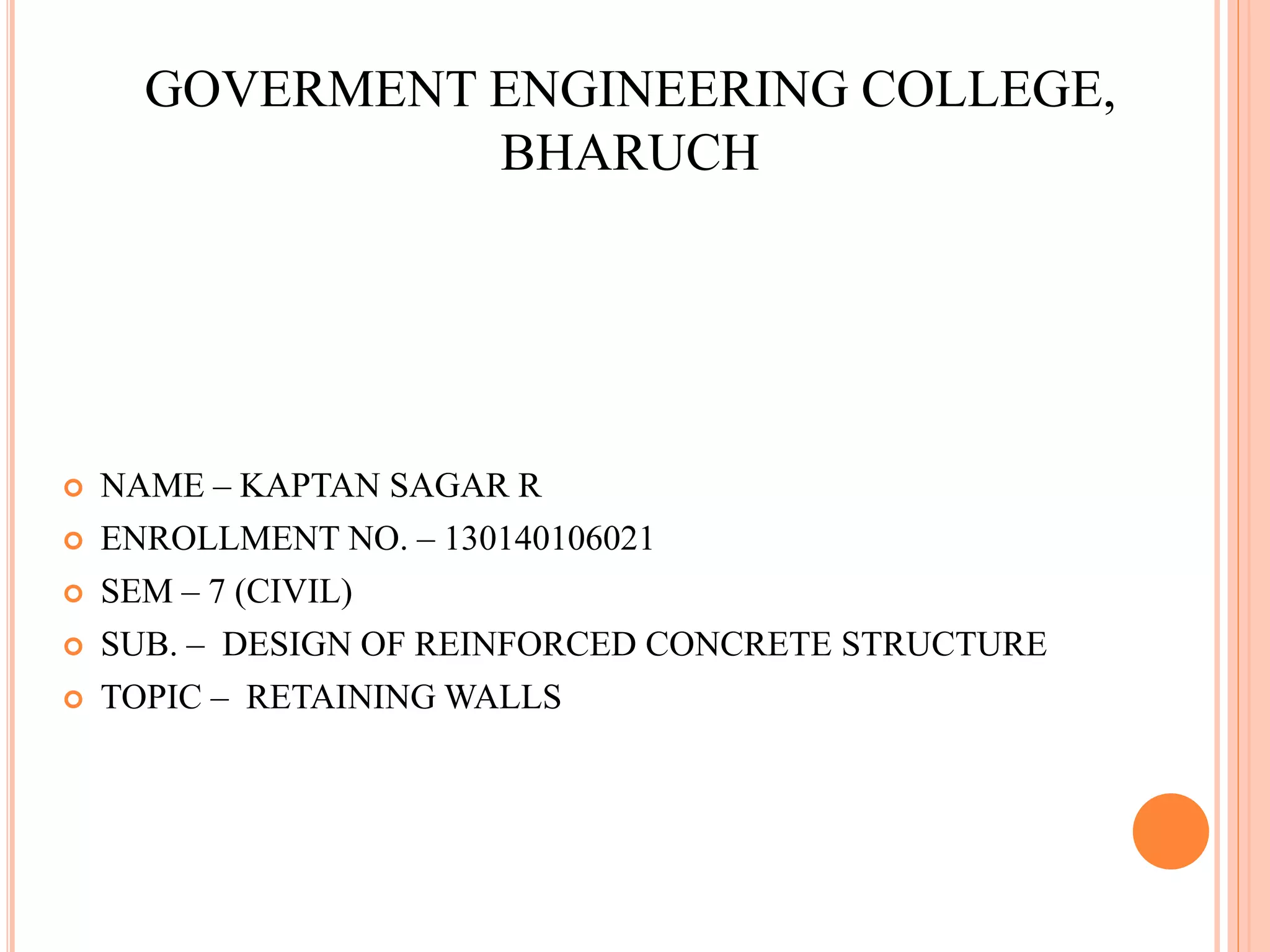 This document provides information about retaining walls for a civil engineering student's class on reinforced concrete structures. It defines different types of retaining walls including gravity, cantilever, counterfort, and buttress walls. It discusses factors that affect earth pressure on retaining walls like soil type, height of wall, and slope of backfill. Methods for analyzing stability, overturning, sliding, and pressure distribution are presented. Design considerations like proportions, depth of foundation, and structural behavior are also covered.