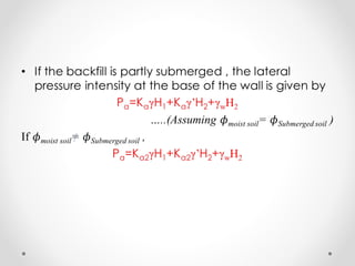 Retaining walls are used to retain earth in a vertical position where there is an abrupt change in ground level. There are several types of retaining walls including gravity, cantilever, counterfort, and buttress walls. Cantilever walls are the most common type for heights up to 8 meters. They consist of a vertical stem and base slab that behave like one-way cantilevers. Counterfort walls include transverse supports called counterforts to reduce bending moments in the stem and slabs. Proper design of the stem, heel slab, toe slab, and foundation depth is required to resist overturning, sliding, soil pressure, and bending failure.