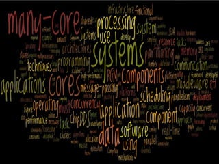 The document discusses the challenges and advancements in many-core systems, focusing on collaborative research at the University of North Carolina. It highlights issues with existing embedded software stacks, communication methods, and innovative techniques for achieving scalable applications in various domains. Key areas include scalable scheduling, resource allocation, and the development of middleware for better concurrency management.