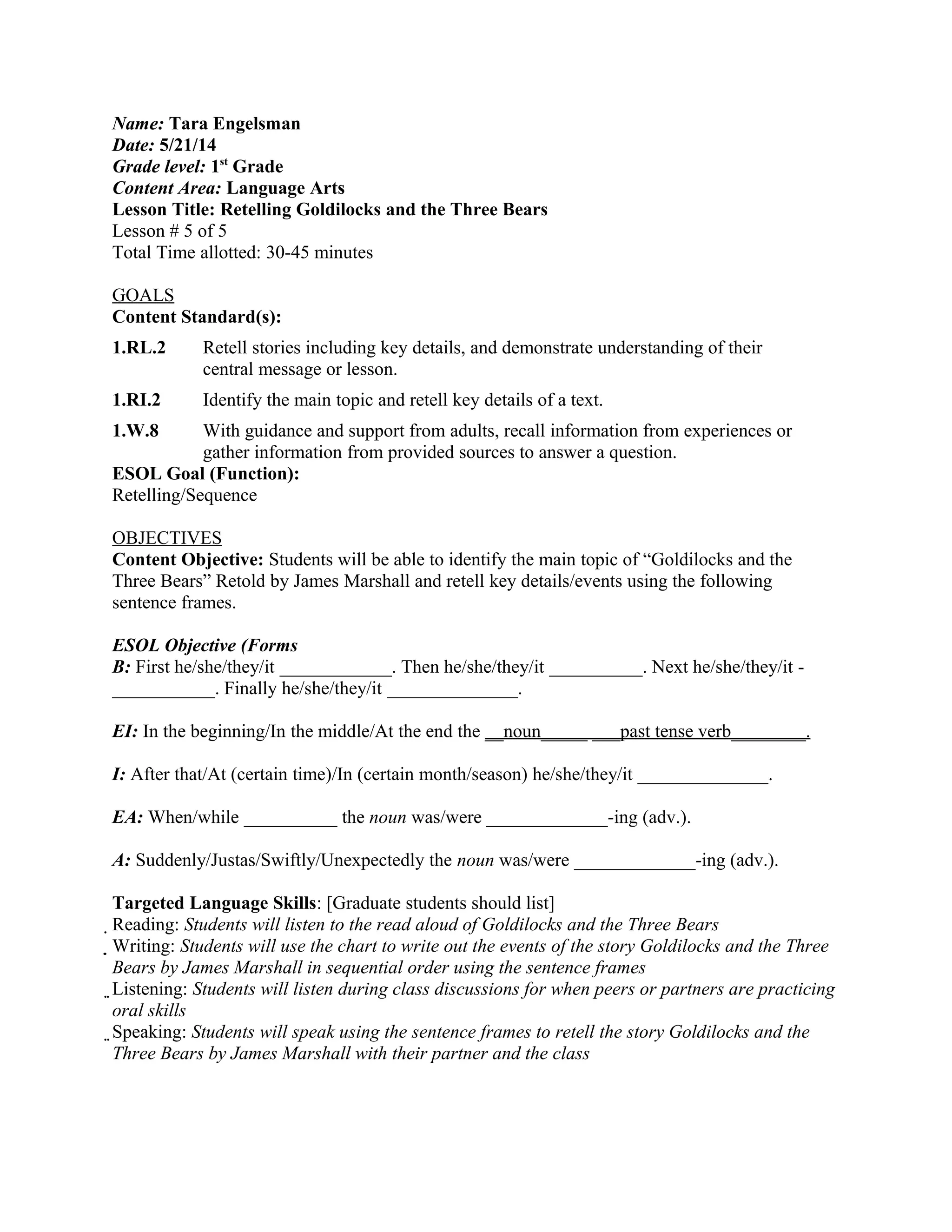This lesson plan aimed to teach 1st grade students to retell the story of "Goldilocks and the Three Bears" using key details. Students would create a graphic organizer with the beginning, middle, and end events of the story. They would then practice retelling the story sequentially to partners using sentence frames. Differentiation for English language learners included highlighting ESOL objectives and strategies. The teacher would assess students' understanding through observation of partner work and listening for accurate use of sentence frames.