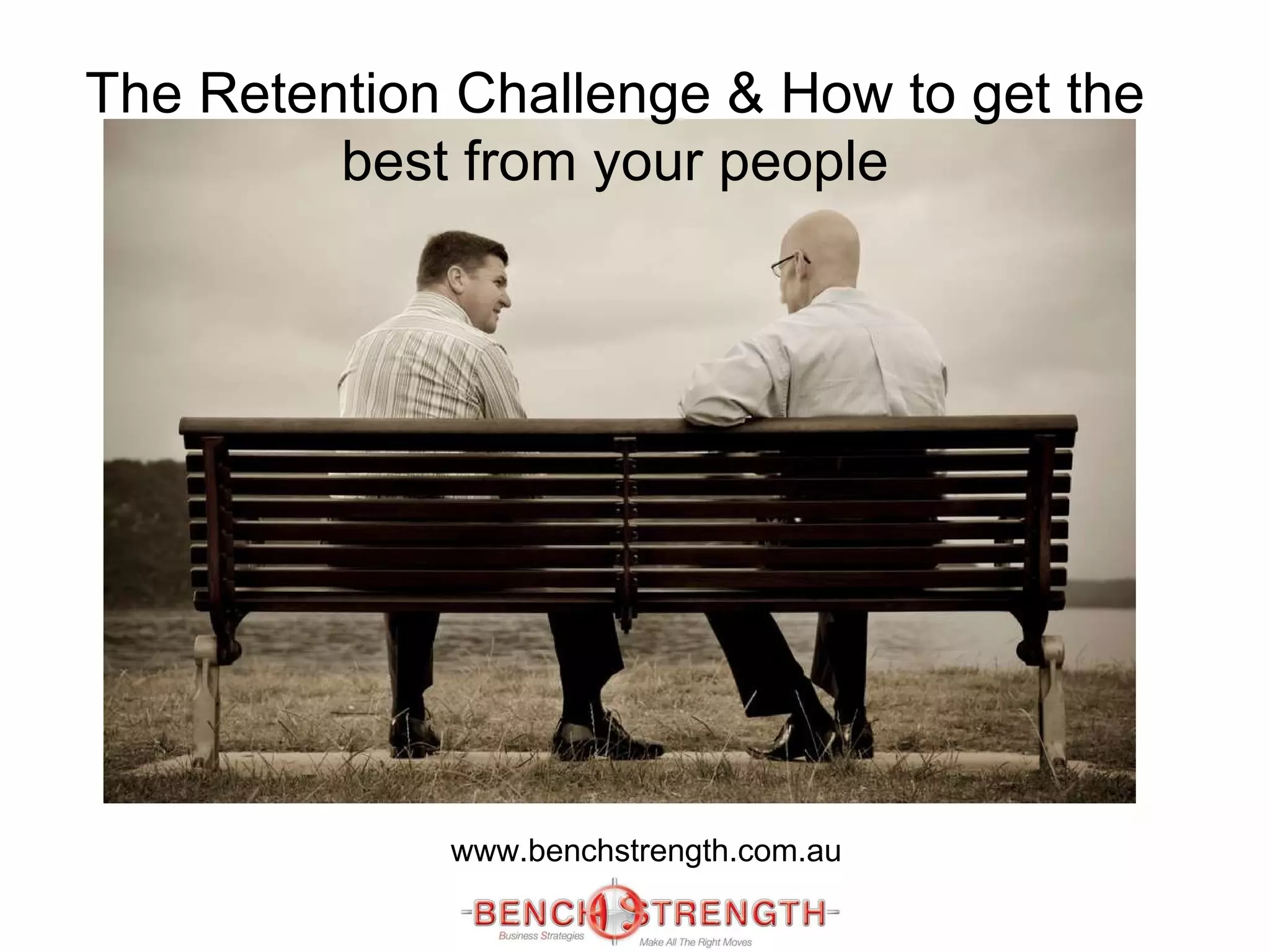 The document discusses the importance of employee retention and provides strategies for improving retention. It notes that employees often leave due to poor management, lack of development opportunities, and not feeling valued. High turnover is costly. The document recommends adapting leadership styles to different generations, providing career development, aligning HR with business strategy, and ensuring new employees have a good onboarding process. Improving retention requires focusing on employees' needs for meaningful work, career growth, trust in leadership, and feeling cared for.