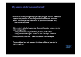 The document discusses various strategies and practices organizations can implement to enhance employee retention, highlighting efforts from companies like Airtel, HDFC Bank, Yes Bank, Google, Whirlpool, Apple, and Oracle. Key strategies include effective recruitment, transparent communication, recognition of employee contributions, and proactive management of employee needs and satisfaction. It also contrasts personal and general opinions on retention strategies, emphasizing the importance of creating a supportive work environment.