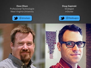 This document discusses the necessity for higher education institutions to rethink their approaches to mobile web design, noting that mobile traffic is on the rise and may soon surpass desktop usage. It emphasizes the importance of responsive design, planning, optimization, and testing to enhance user experience across multiple devices. Additionally, statistics and insights highlight the significance of mobile accessibility for prospective students and the need for institutions to adapt to these changing trends.