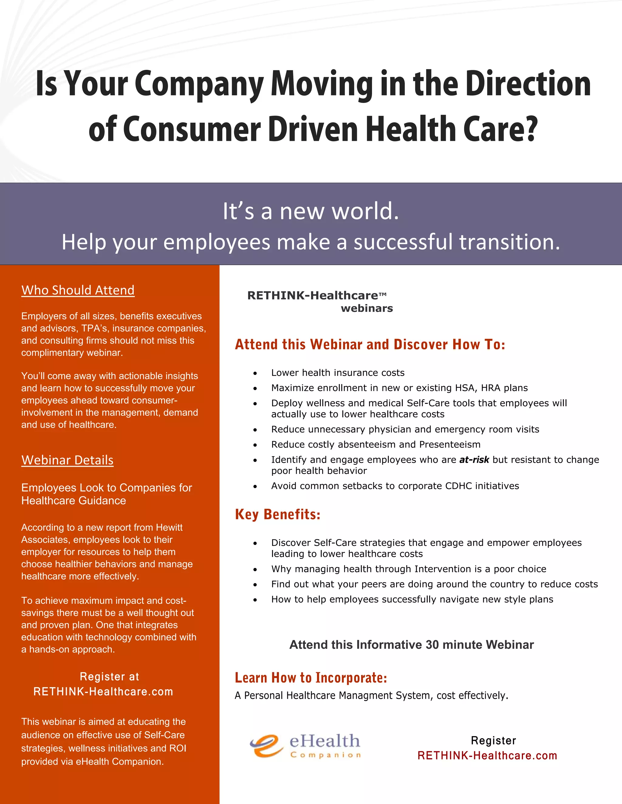 The document promotes a complimentary webinar aimed at helping employers transition employees to consumer-directed health plans (CDHPs) like HSA and HRA, along with strategies to lower health insurance costs. It emphasizes the importance of providing health education tools and self-care strategies to enhance employee health literacy and engagement. The webinar features the eHealth Companion, a personal healthcare management system designed to empower employees and improve healthcare outcomes.