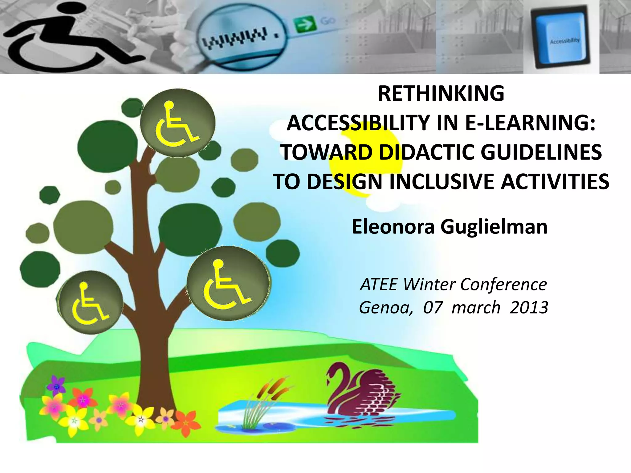 The document discusses the importance of rethinking accessibility in e-learning for students with disabilities in Italy, emphasizing the need for inclusive design guidelines. It outlines the critical areas of technological and pedagogical accessibility, advocating for universal design principles to ensure access for all students. The research presents a structured framework of guidelines aimed at creating accessible e-learning courses and identifies future trends for enhancing accessibility in educational environments.