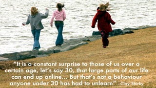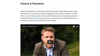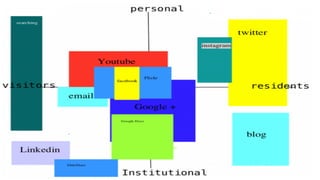 The document discusses digital citizenship and establishing residency online. It encourages individuals to claim their online presence by purchasing a domain name, which serves as establishing a home base on the internet. The document also discusses the importance of contributing to online communities and thinking carefully before reposting or retweeting content online. Maintaining privacy and understanding how personal information flows are also addressed as important aspects of digital citizenship.