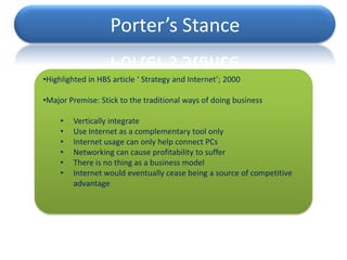 The document discusses Porter's stance on business strategy and the internet from 2000. Porter believed that companies should: