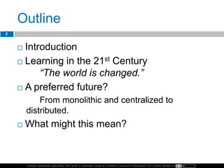 The document discusses the evolution of learning paradigms in the 21st century, emphasizing a shift from centralized education systems to more distributed and modular approaches. It highlights factors such as the financial crisis, the growth of open educational resources, and the importance of continuous learning. The author, Brandon Muramatsu, presents insights on the design of learning experiences and the implications for educational systems and technology.