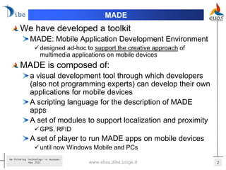The Elios Lab's Lodestar project aims to enhance the experience of visually impaired individuals in cultural and naturalistic locations through a toolkit for mobile application development that includes proximity awareness features. This toolkit allows for the creation of multimedia applications that integrate various content types, such as audio descriptions and spatial information, accessible to users via simple controls. The project has yielded real-world applications, including tour guides and gaming experiences, with positive feedback from experimental users.