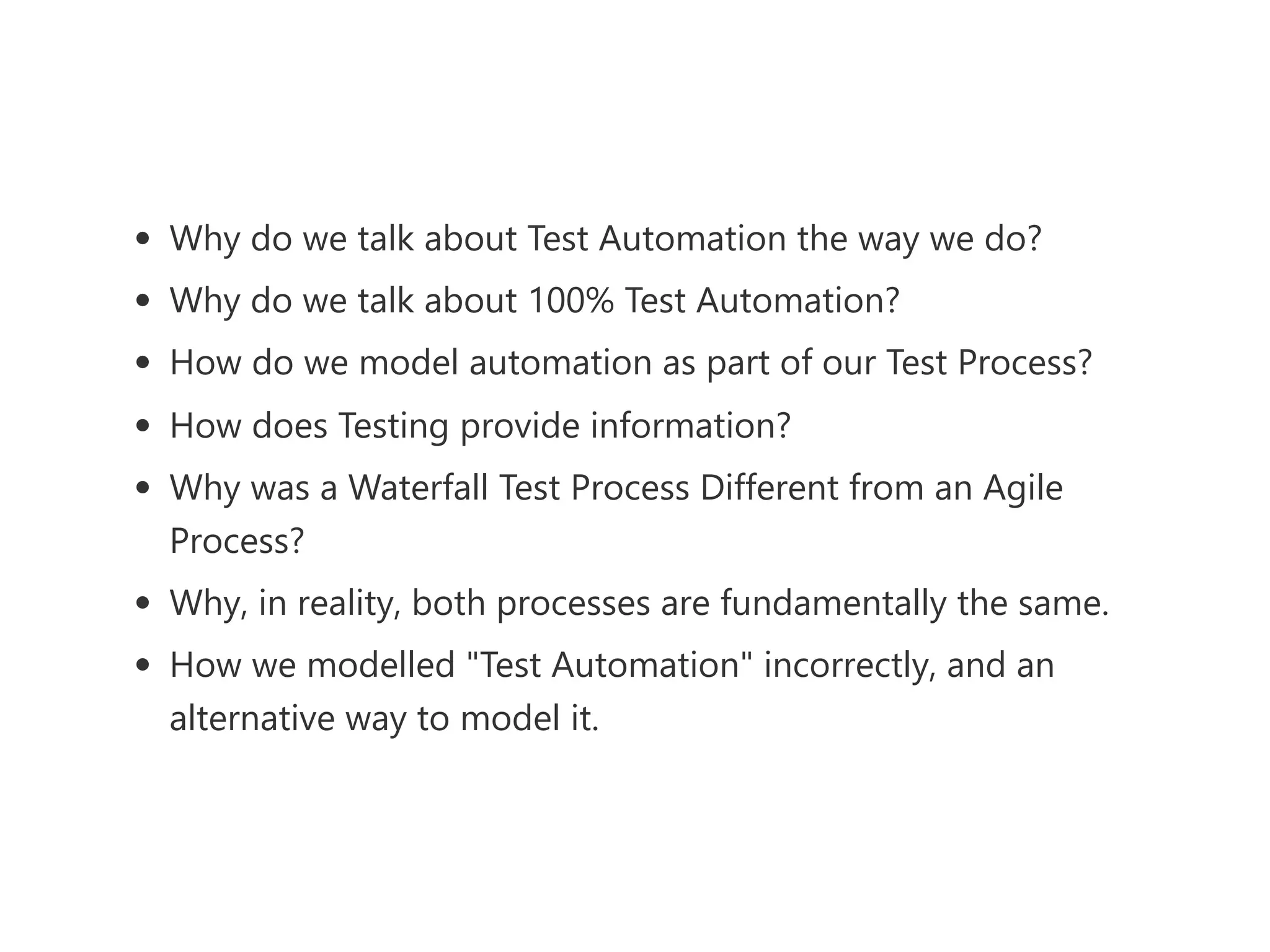 The document discusses the complexities and misconceptions surrounding test automation, emphasizing the need to model automation effectively within the testing process. It critiques traditional linear models of testing for lacking feedback and cyclical learning, proposing a more holistic approach that integrates exploration and learning. Highlighting the role of data versus information, it suggests that true automation should focus on conditions and requirements rather than just test execution.