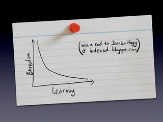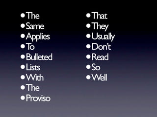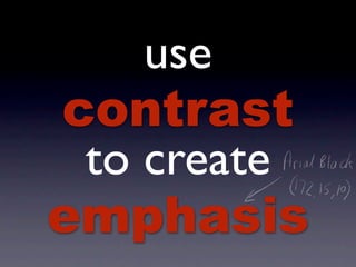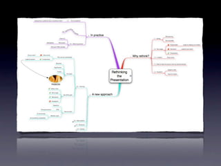 The document discusses effective presentation techniques to avoid boring audiences, emphasizing minimal text on slides to enhance engagement and comprehension. It recommends using visuals instead of text and rehearsing to boost confidence and delivery. Key points include creating one main idea per slide and using contrast for emphasis, while also considering the overall outcomes of the presentation.