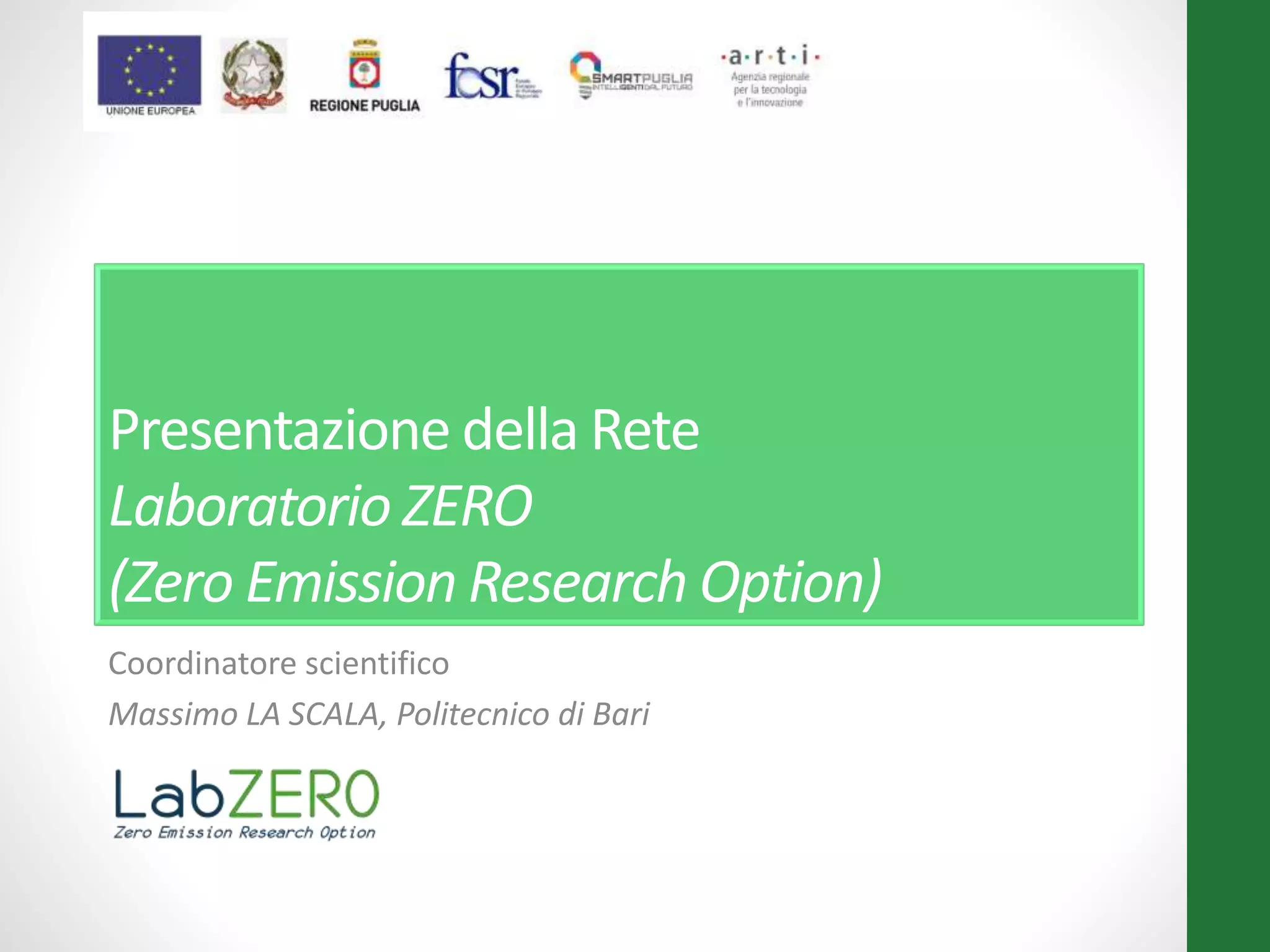 La rete laboratorio zero, coordinata dal Politecnico di Bari, si propone di fornire strumentazione e metodologie ricercate per la produzione e gestione di energia da fonti rinnovabili, puntando anche sull'efficienza energetica. Tra gli obiettivi ci sono la certificazione di nuovi componenti e il miglioramento della mobilità intelligente e del lighting. Le attività programmate includono la realizzazione di appalti, lavori edili e l'allestimento del laboratorio entro la fine del 2015.