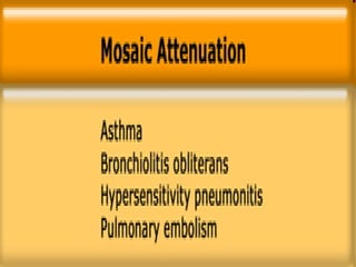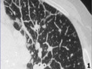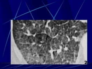 The document discusses the reticular pattern seen on CT scans of the lung. A reticular pattern results from the superimposition of irregular linear opacities, forming a mesh-like or network appearance. Reticular opacities can be fine, medium, or coarse depending on the width of the opacities. A classic reticular pattern is seen in pulmonary fibrosis where curvilinear opacities form small cystic honeycomb spaces along the pleural margins and bases. Potential causes of interlobular septal thickening seen on CT include pulmonary edema, lymphangitic carcinomatosis, fibrosis, and sarcoidosis. Honeycombing signifies the presence of fibrosis and is seen commonly in idiopathic
