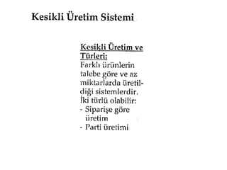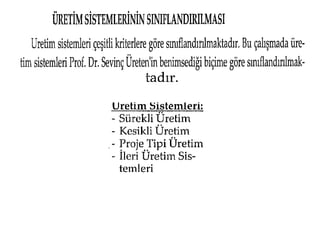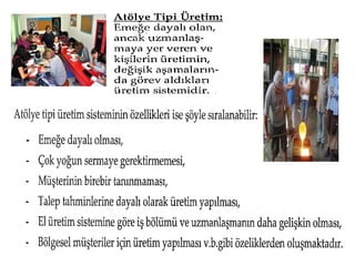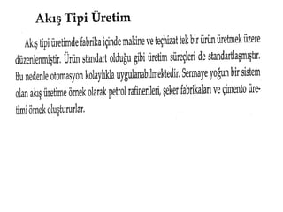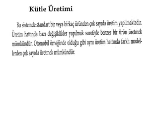 Esnek Üretim Busistemler bilgisayar yazılım talimatlarına göre çalışma yeteneği olan ileri derecede otomasyona dayalı sistemlerdir. Büyük miktarlarda üretim yapılabilir. Esnek üretim sistemleri; bir üründen diğerine geçişte, makine hazırlık ve diğer işlemler için zaman kaybetmeden farklı ürünleri üretebilme yeteneğine sahip sistemlerdir. Bu esneklikler; ürün esnekliği, ürün karması esnekliği ve ürün miktarı esnekliğidir.