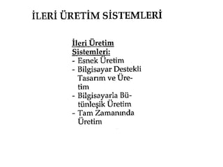 İleri Üretim SistemlerininÖzellikleri Makineleşme ve otomasyon, İşbölümü ve uzmanlaşma, Standartlaşma, Esneklik, Bütünleşme (Entegrasyona) olanak verme
