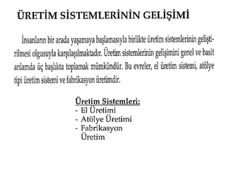 Bilgisayarda Bütünleşik ÜretimÜretim sistemlerinin toplam işleyişi, tasarımla başlayıp, üretimle devam etmekte, stok yönetimi, finansal yönetim ve dağıtımla son bulmaktadır. Toplam işleyişteki süreçlerin tamamını yönetmek için, bilgisayara dayalı üretim teknolojisi ile karar destek sistemlerinin bütünleşik uygulaması bilgisayarla bütünleşik üretim sistemini oluşturmaktadır. Bu sistem üretim sistemini üç boyutta bütünleştirmektedir; Ürün ve süreç tasarımı, Planlama ve denetim, Üretim süreçleri.