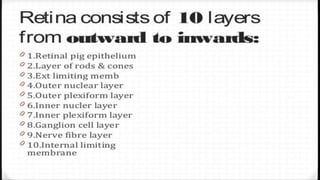 The retina contains 10 layers that process light signals from the eyes. The outermost layer is the retinal pigment epithelium, which absorbs light and prevents reflection. Next are the layers of rods and cones, the light-sensitive cells responsible for vision. Moving inward are the outer limiting membrane, outer nuclear layer, outer plexiform layer, inner nuclear layer, inner plexiform layer, ganglion cell layer, nerve fiber layer, and internal limiting membrane. Each layer has specialized cells and functions that allow light signals to be transmitted via the optic nerve to the brain for visual perception and interpretation. Damage to the retina can cause diseases like retinitis pigmentosa, macular degeneration, and diabetic or hypertensive ret