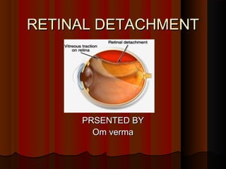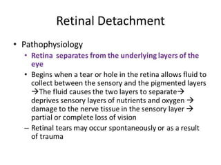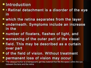 Retinal detachment is a disorder of the eye in which the retina separates from its underlying supportive layer. Symptoms include an increase in floaters, flashes of light, and worsening vision. Without treatment, permanent vision loss can occur. Retinal detachment is commonly caused by breaks or tears in the retina that allow fluid from the eye to enter and separate the retina. Risk factors include nearsightedness, eye injuries or surgeries, and family history. Diagnosis involves examination of the eye and retina using instruments like an ophthalmoscope or ultrasound.