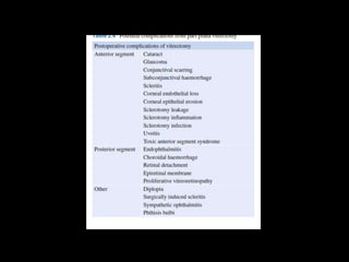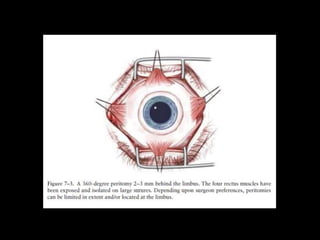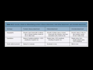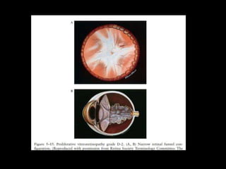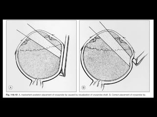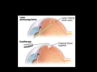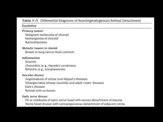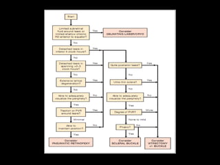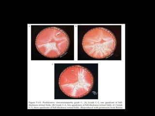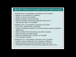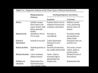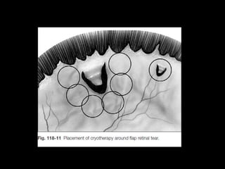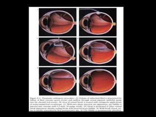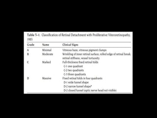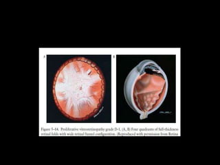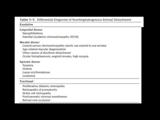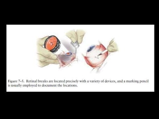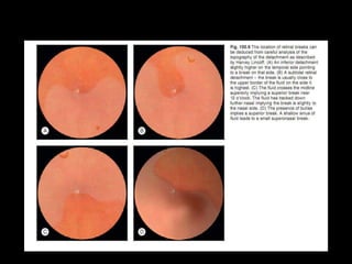 The document discusses the anatomy and examination of the peripheral retina. It provides definitions for key terms related to retinal detachment such as the vitreous base, vitreoretinal traction, posterior vitreous detachment, and retinal breaks. It also describes techniques for indirect ophthalmoscopy and scleral indentation which are used to clinically examine the peripheral retina.