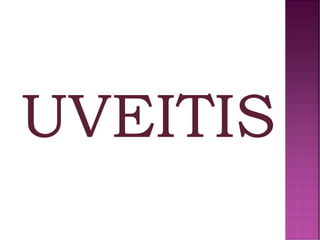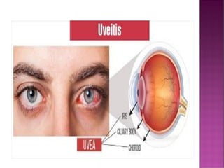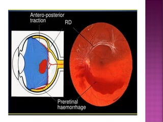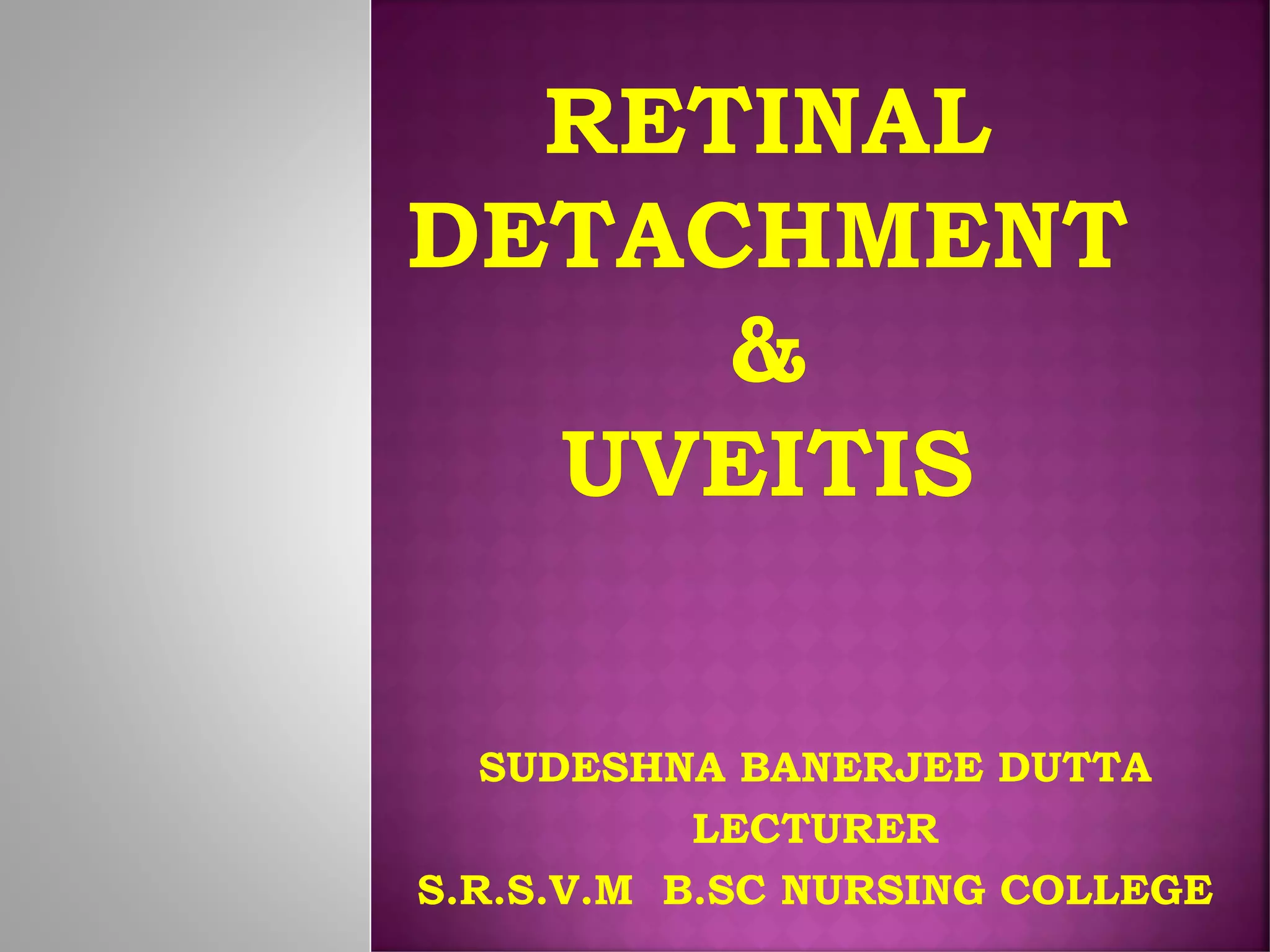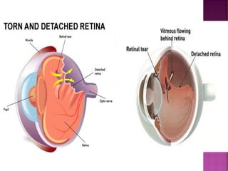This document discusses different types of retinal detachment, including rhegmatogenous retinal detachment caused by tears or breaks in the retina, tractional retinal detachment caused by scar tissue pulling on the retina, and exudative retinal detachment caused by fluid collecting under the retina without tears. It also discusses uveitis, an eye inflammation affecting the middle layer of the eye wall, and its potential causes and symptoms. Treatment options mentioned include cryosurgery, electrodiathermy, scleral buckling surgery, corticosteroids, antivirals, and antibiotics.