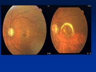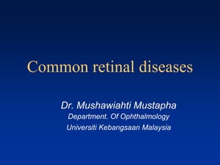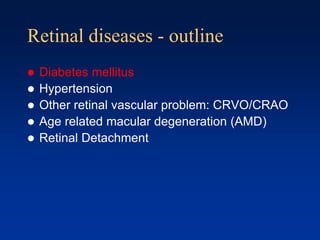 This document provides an overview of common retinal diseases, including diabetes mellitus, hypertension, retinal vascular disorders, age-related macular degeneration, and retinal detachment. It describes the pathogenesis, symptoms, classifications, and treatments for each condition. For diabetes mellitus, it discusses diabetic retinopathy in detail, from microaneurysms and neovascularization to laser treatment options. For hypertension, it covers hypertensive changes to the retina and their grading system. Age-related macular degeneration is differentiated as dry or wet forms. Retinal detachment causes and management are also outlined.