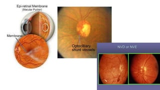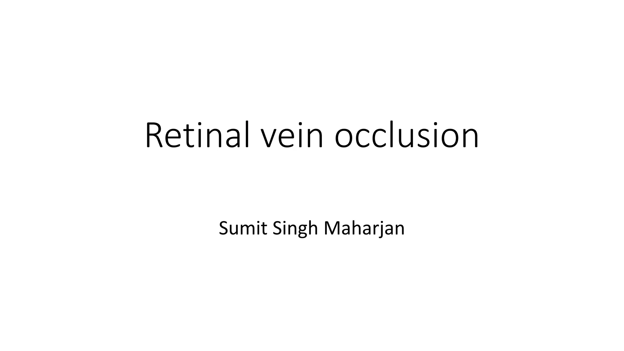 This document discusses retinal vein occlusion, specifically branch retinal vein occlusion (BRVO) and central retinal vein occlusion (CRVO). It covers the epidemiology, risk factors, pathogenesis, clinical presentation, treatment options including laser photocoagulation, corticosteroids and anti-VEGF drugs, and complications such as macular edema and neovascularization. Key points include that BRVO most commonly affects the superotemporal quadrant and that perfusion status on fluorescein angiography helps determine prognosis for CRVO.