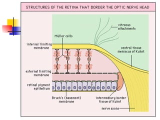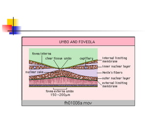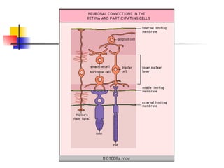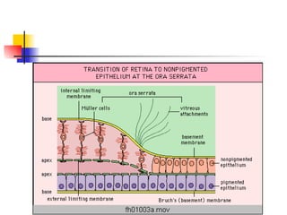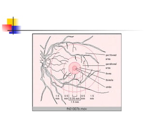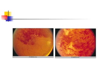 The document summarizes various retinal diseases including retinal vein occlusion, retinal artery occlusion, retinal detachment, and retinitis pigmentosa. It describes the symptoms, risk factors, detection methods, and potential treatments for each condition. The diseases can cause blurred or lost vision and are typically diagnosed via examination of the retina using an ophthalmoscope. While treatments aim to address complications, restoring full vision loss is often not possible depending on the severity and type of condition. Research continues on developing treatments and potential prosthetics to help treat retinal diseases.