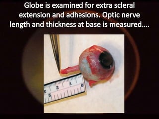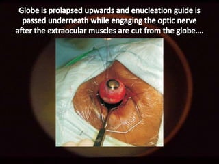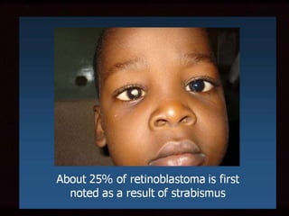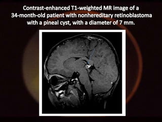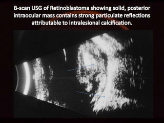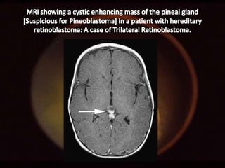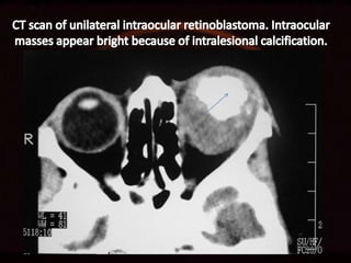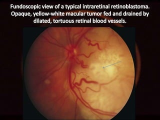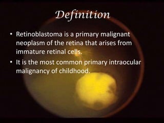 Retinoblastoma is a malignant neoplasm of the retina, primarily affecting children, with a tendency to metastasize and invade the brain, leading to a poor prognosis if untreated. There are two types: congenital, associated with germline RB gene mutations, leading to bilateral cases, and sporadic, where mutations occur in a single retinal cell, usually resulting in unilateral tumors. Diagnosis involves various imaging techniques, and treatment options include chemotherapy, enucleation, and radiation therapies.