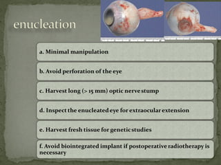 3. Presenting features, diagnostic testing, classification systems, and treatment options for retinoblastoma such as chemotherapy, radiation therapy, cryotherapy, and enucleation.