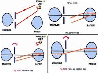Dr. Pushkar Dhir gave a seminar on retinoscopy. He discussed how retinoscopy works by illuminating the retina and observing the light reflex. It can be used to objectively measure refractive error in infants and others who cannot communicate. Both dry and wet retinoscopy were explained. Challenges like an unclear red reflex due to media opacity or high refractive error were addressed. Subjective refinement using techniques like the Jackson Cross Cylinder was also covered. The seminar provided an in-depth overview of the retinoscopy procedure and techniques.