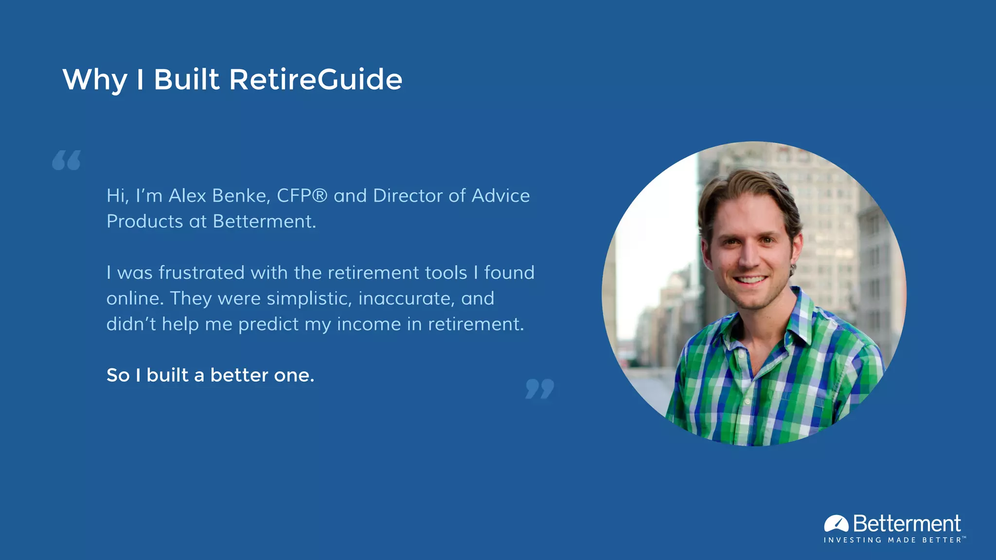 Betterment's RetireGuide offers personalized retirement planning tools that integrate all retirement assets and income sources, including social security, to provide up-to-date projections and customized advice. Users can simulate different retirement scenarios, adjust assumptions, and receive specific investment recommendations to help achieve their retirement goals. The service is free with no minimum balance requirement and aims to help users stay on track for a comfortable retirement.