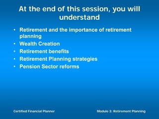 The document discusses retirement planning and provides information about retirement benefits. It covers topics such as the importance of retirement planning, sources of retirement income like government and company programs, retirement benefit schemes, and strategies for retirement planning such as maximizing workplace savings and establishing IRAs. The document aims to help people understand retirement and the need for financial planning to ensure a comfortable retirement.