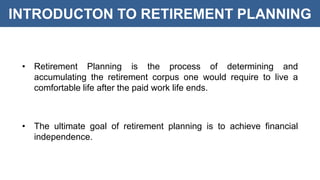 Retirement planning involves determining the amount of money needed for a comfortable life after work, aiming for financial independence by preparing for a post-retirement duration of 25 to 35 years. Key considerations include inflation, medical expenses, and the need for a diversified investment portfolio, estimating that an average retirement corpus could range from 5-10 crores depending on various factors. Strategies for efficient management include regular investments, avoiding high debt, and ensuring adequate health insurance.
