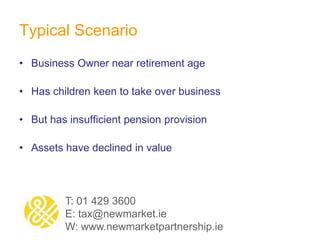 This document discusses retirement planning options for business owners in the current economic climate. It outlines a typical scenario where a business owner wants to retire but feels they cannot due to insufficient pension savings and declining business assets. The document proposes creating a "win-win-win" situation where the business owner can retire with greater security through an accelerated payment plan, the next generation gains control of the business at a low cost, and the company saves on retirement costs without impacting cash flow. However, it cautions that tax reliefs for retirement may not be available for much longer.