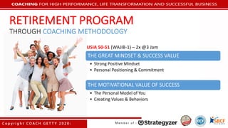 The document outlines a comprehensive retirement program by coach Margetty Herwin, focusing on personal development, health, financial planning, and business skills for individuals aged 50 to 55. It emphasizes creating a strong positive mindset, establishing personal vision and mission, and practical methodologies for life and business planning. Resources and coaching services are provided through various online platforms and mobile apps.