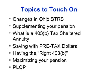 This document discusses retirement planning topics for Ohio STRS pension recipients, including pending changes that will increase retirement ages and contribution amounts while reducing cost of living adjustments. It recommends supplementing a pension with pre-tax contributions to a 403(b) tax-sheltered annuity. Choosing the right investment options like fixed indexed annuities can help maximize gains while avoiding losses. Key decisions like taking the full pension or joint survivor options can significantly impact the amount received. A PLOP allows rolling over a partial lump sum payment without tax consequences.