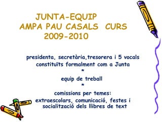 JUNTA-EQUIP AMPA PAU CASALS CURS 2009-2010 presidenta, secretària,tresorera i 5 vocals constituïts formalment com a Junta * equip de treball * comissions per temes: extraescolars, comunicació, festes i socialització dels llibres de text