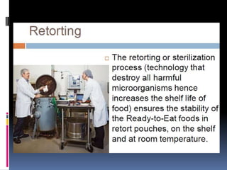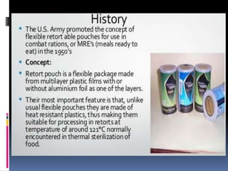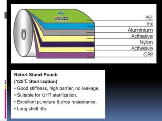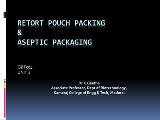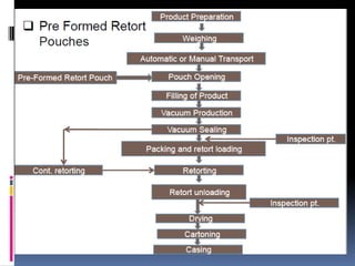 This document discusses retort pouch packaging and aseptic packaging. It describes retort pouches as a type of flexible packaging made from laminated plastic and metal foils. This allows for the sterile packaging of foods through aseptic processing, as an alternative to canning. The document outlines different retort pouch styles, materials, filling and sealing processes, defects to check for, integrity testing methods, and major players in the retort pouch industry. It also lists different types of microorganisms important to control in retorted foods through the thermal processing in retort pouches.