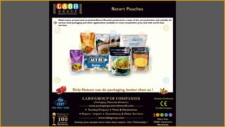 Labh Group is a leading global manufacturer and exporter of retort pouches and packaging materials from India. They operate an advanced manufacturing facility with stringent quality control. Labh Group has a global presence in over 100 countries and offers competitive pricing, high quality materials, and excellent customer service and logistics support. They are ISO 9001-2008 certified with over 20 years of experience innovating packaging solutions.