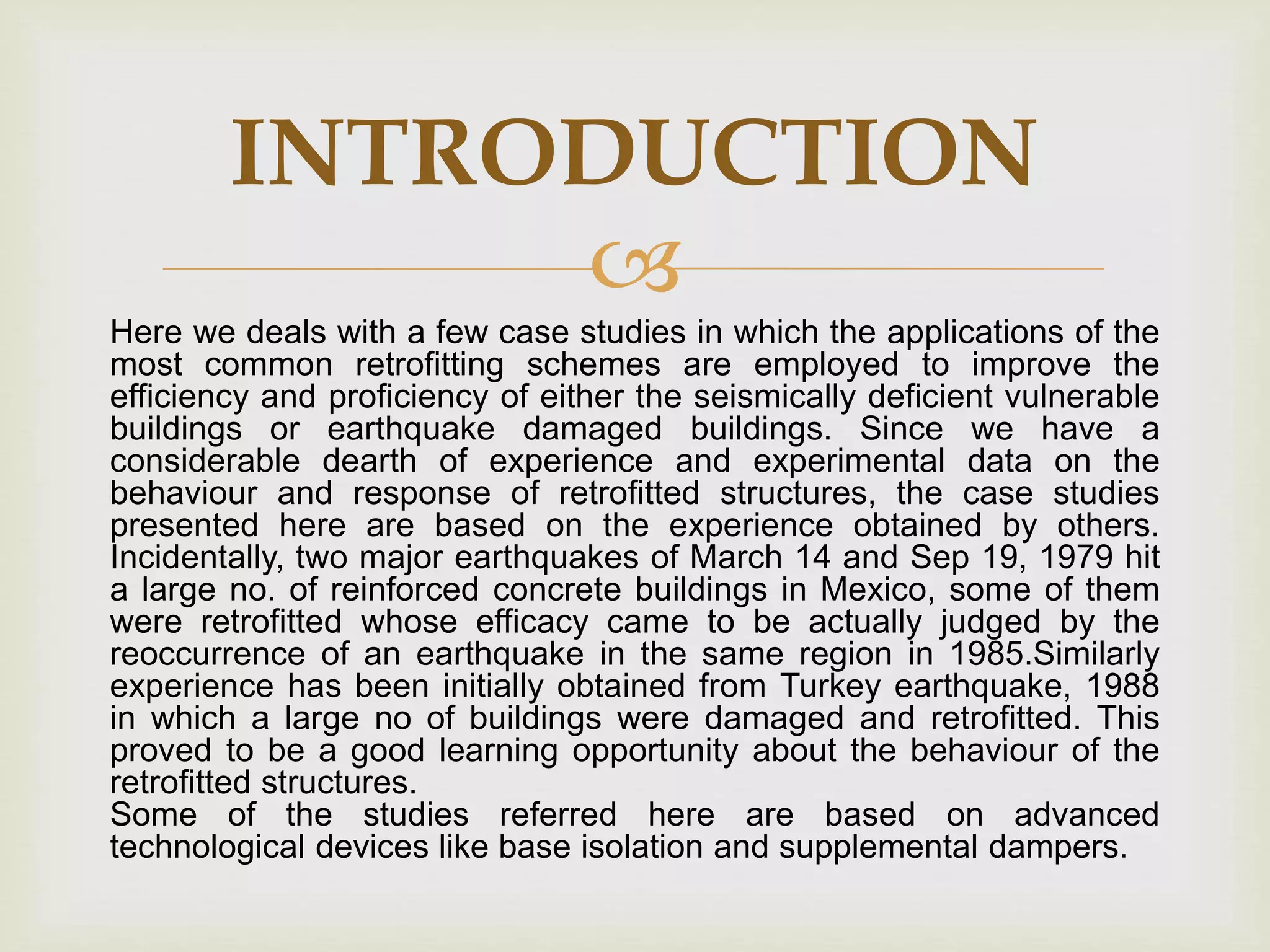 This document discusses several case studies of seismic retrofitting techniques used to improve the performance of vulnerable or earthquake damaged reinforced concrete buildings. It describes the features and damage observed in five buildings from earthquakes in Mexico and Turkey. For each building, it outlines the retrofitting techniques employed such as adding concrete shear walls, bracing, jacketing of columns and beams, and infilling frame bays with shear walls. The expected performance of the retrofitted buildings, based on analytical modeling, was improved seismic resistance and reduced vibration periods.